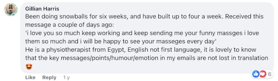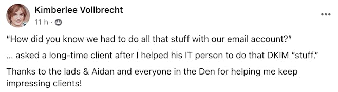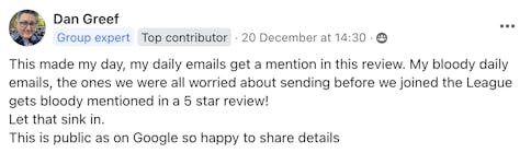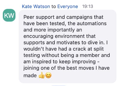 "The team is so incredibly generous with their knowledge and expertise. Not only is everything pre-tried and thoroughly tested, but they also really take the time to help you understand how to apply it in a way that works for your business. People who receive my emails have (apparently) been recommending that other people sign up for them, because of the value they're getting from them. I know what to write now. And I have an overall plan for how email marketing can be working for me".